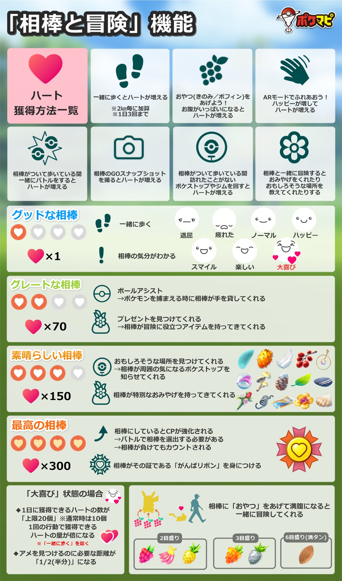 ポケモンgo攻略情報 ポケマピ 相棒と冒険 機能について画像にまとめました ハートの獲得方法一覧や相棒レベルについてまとめて確認できるので 保存するなどしてぜひご活用ください 相棒と冒険機能の仕様や使い方は 記事でご紹介しています